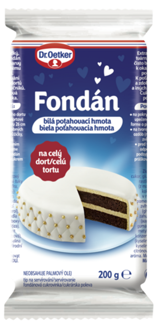 Marcipán je složen z mandlí a cukru. Má vynikající a neopakovatelnou chuť. Marcipán Dr.Oetker obsahuje 40% mandlí, což je množství, díky kterému se s marcipánem stále velmi dobře pracuje, marcipán se netrhá a zároveň obsahuje velmi vysoké procento mandlí. Fondán je složen zejména z cukru a glukózového sirupu. Fondán bílá potahovací hmota Dr.Oetker je extra hladký a pružný, dobře se s ním pracuje a nedrobí se.
